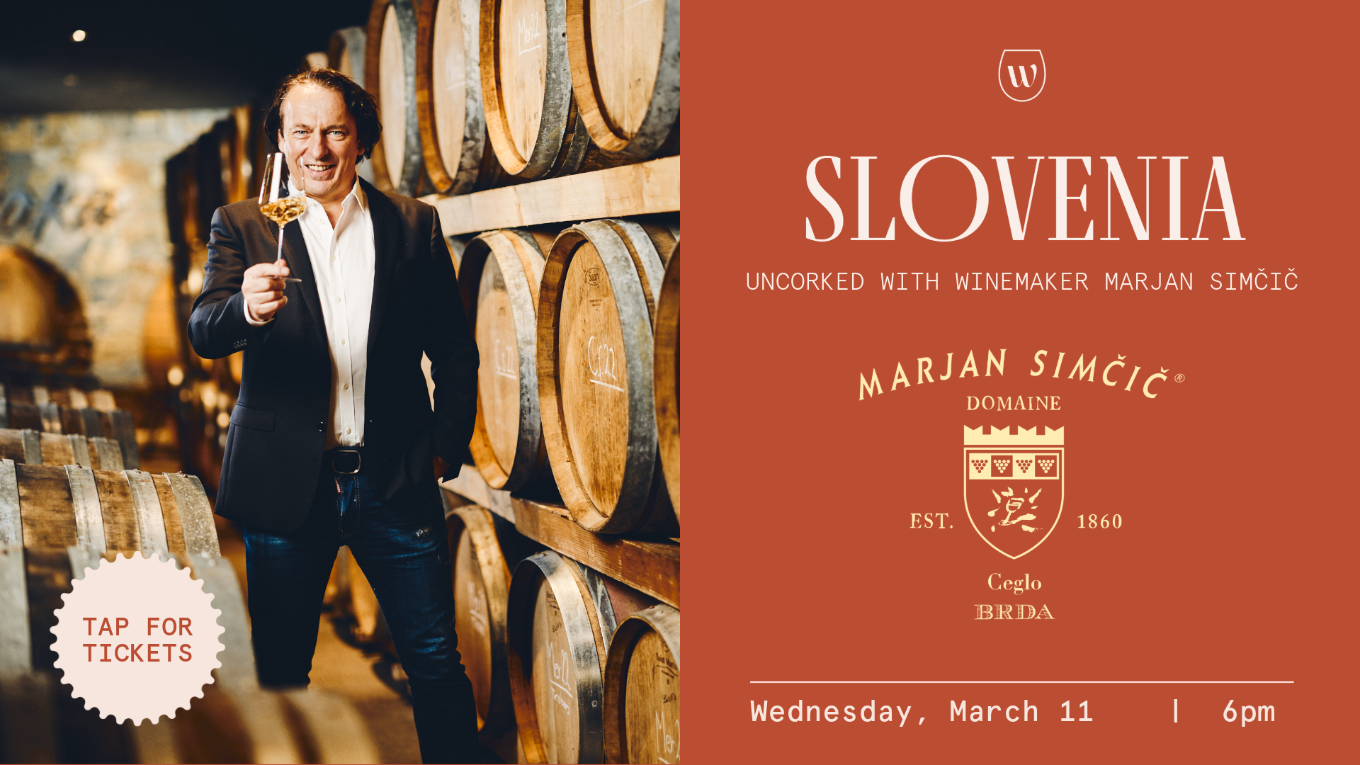 Wednesday, March 11 at 6pm for an evening of discovery, direct from the source. Meet Marjan Simčič — the benchmark winemaker of Slovenia's Brda region, a sun-drenched corner of Europe so beautiful they call it the "Tuscany of Slovenia." With five generations of family winemaking behind him and a deeply hands-on approach that borders on biodynamic, Marjan is the real deal.